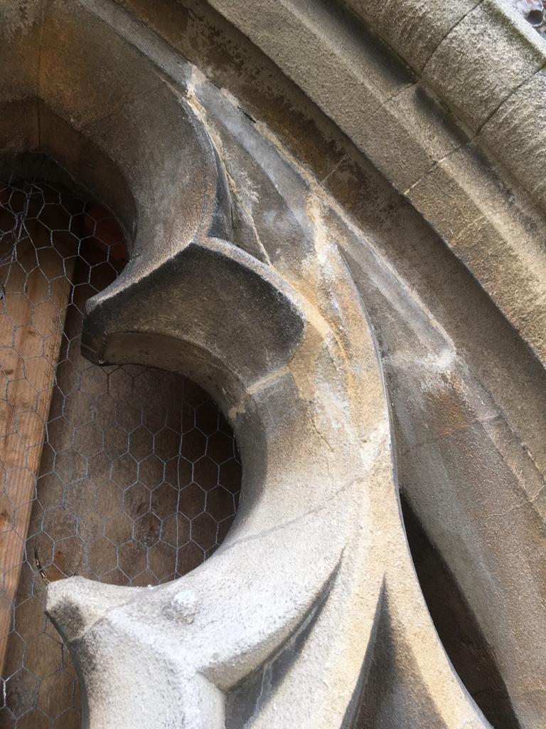 The work has included cutting out old and rusted iron fixings and tie bars and fitting new stainless-steel fixings where required; cutting out spalled stonework readied to receive new stonework; and cutting, carving and fitting the new stonework.